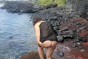 curvy brunette milf dresses sexy for beach mastubation photoshoot 🔥👙 big natural tits flash public