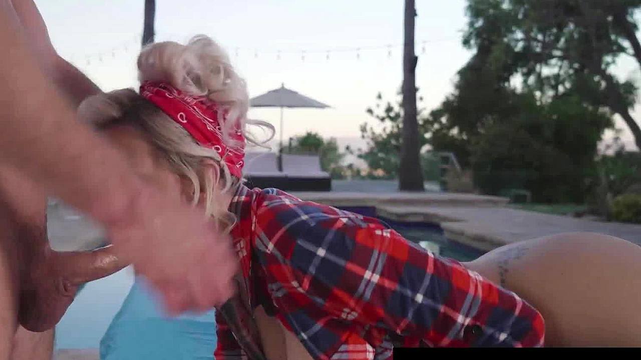 A busty blonde cougar gives a blowjob to a hot toy boy